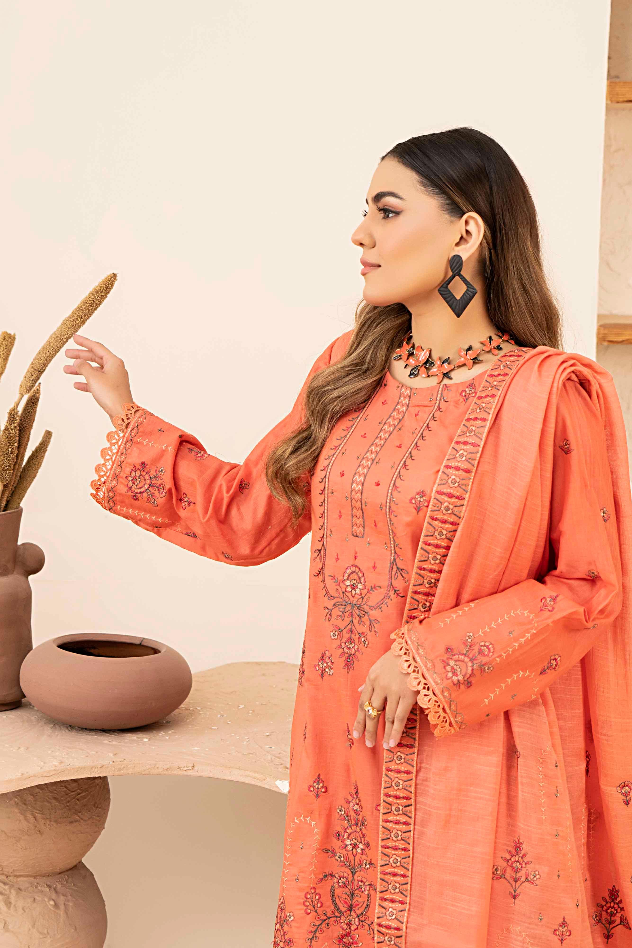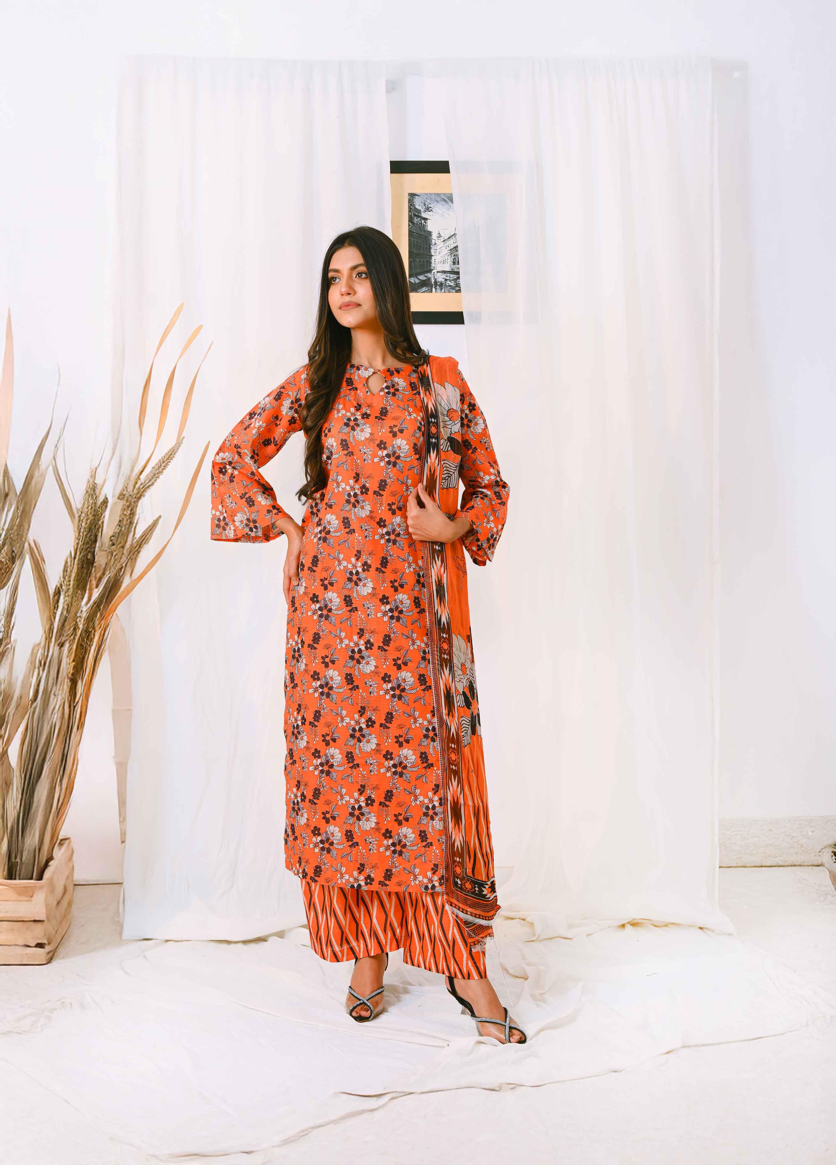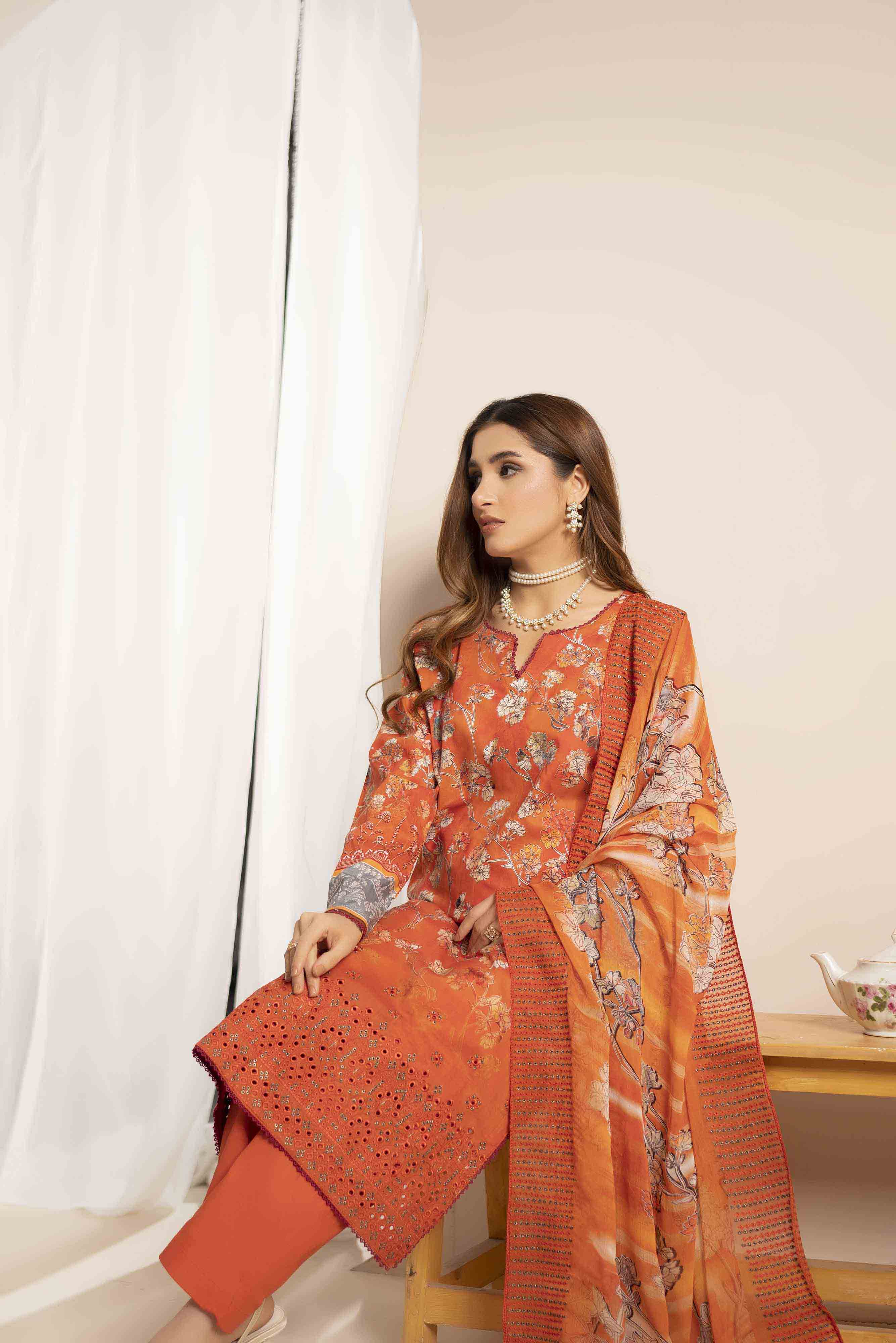Luxury Orange Printed Embroidered 3 Pcs Lawn Set
