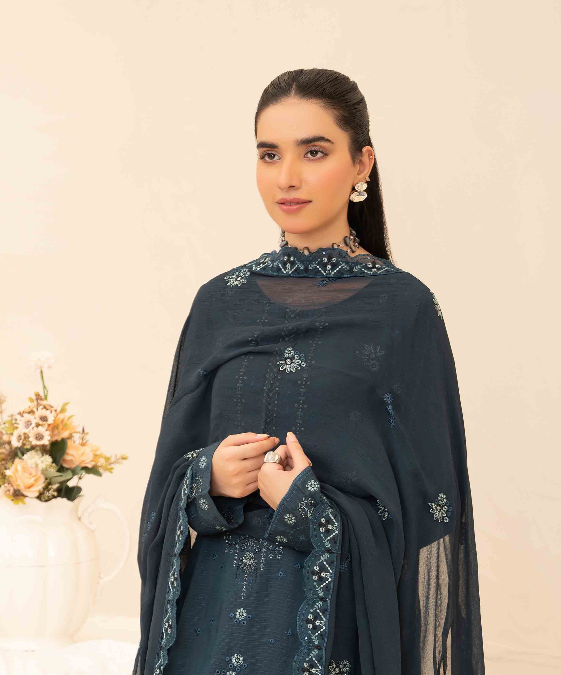 Luxury Blue 3 Pcs Embroidered Dhanak Set