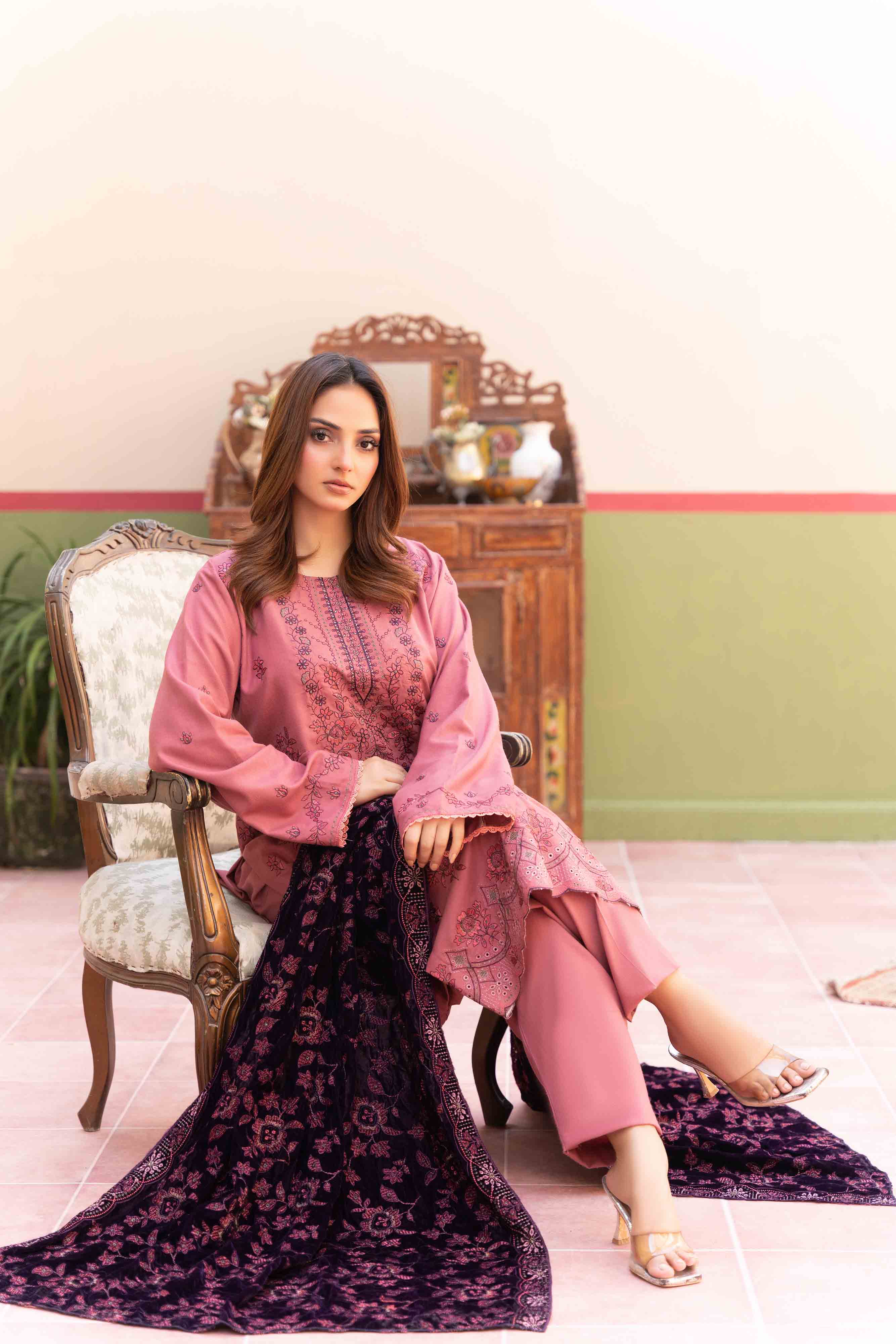 Luxury Pink 3 Pcs Embroidered Dhanak Set