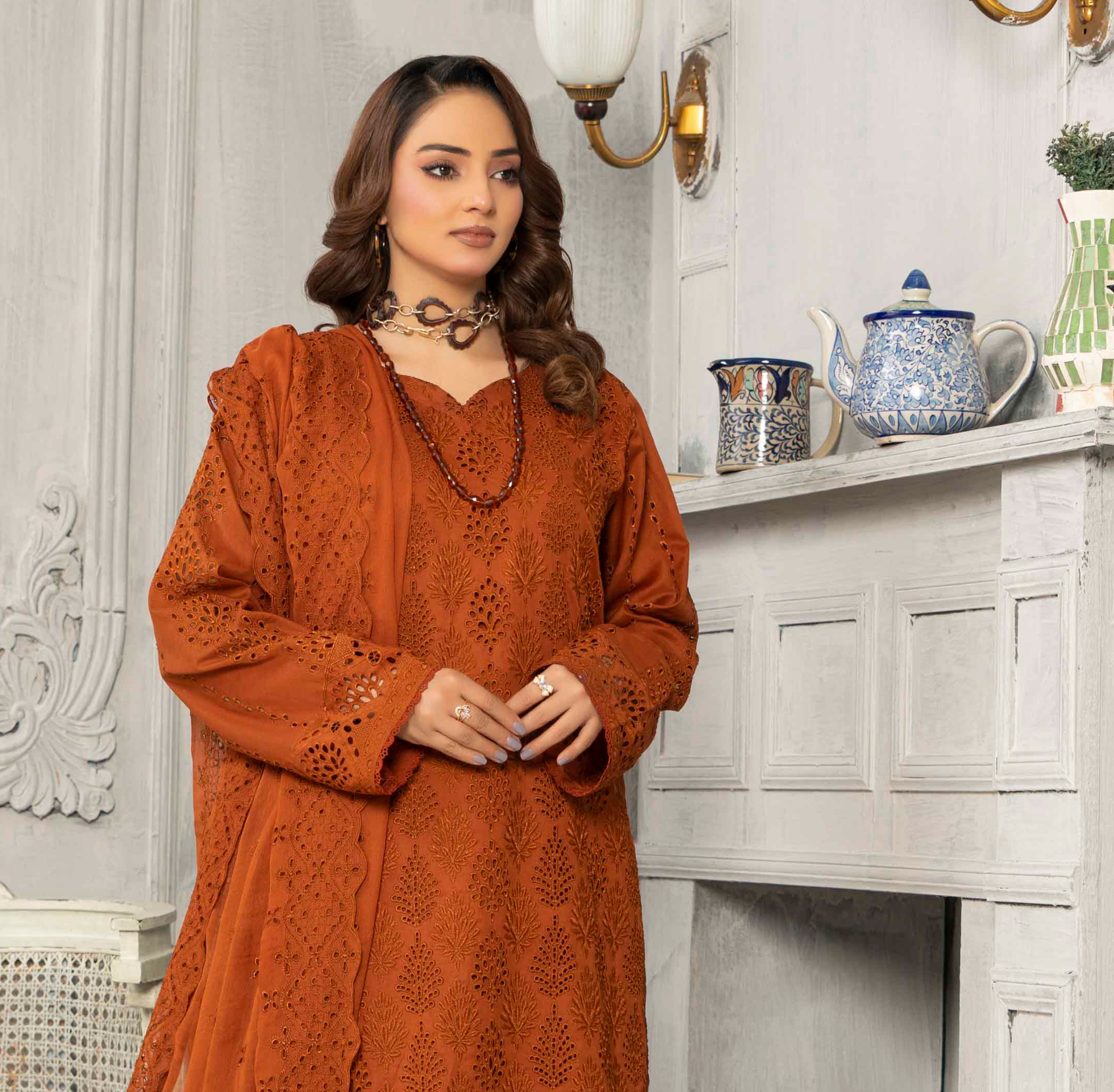 Luxury Rust 3 Pcs Doria Embroidered Viscose Suit