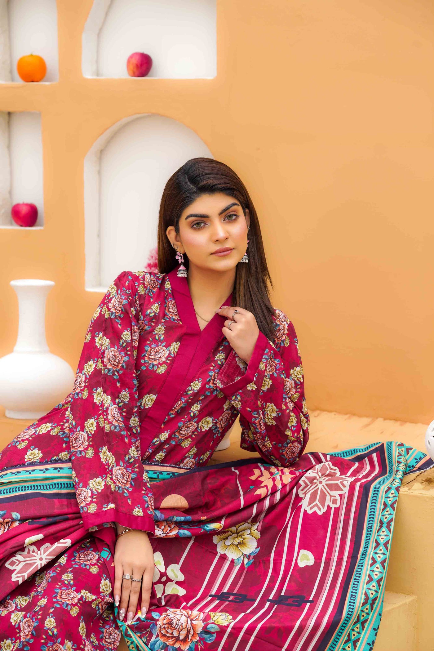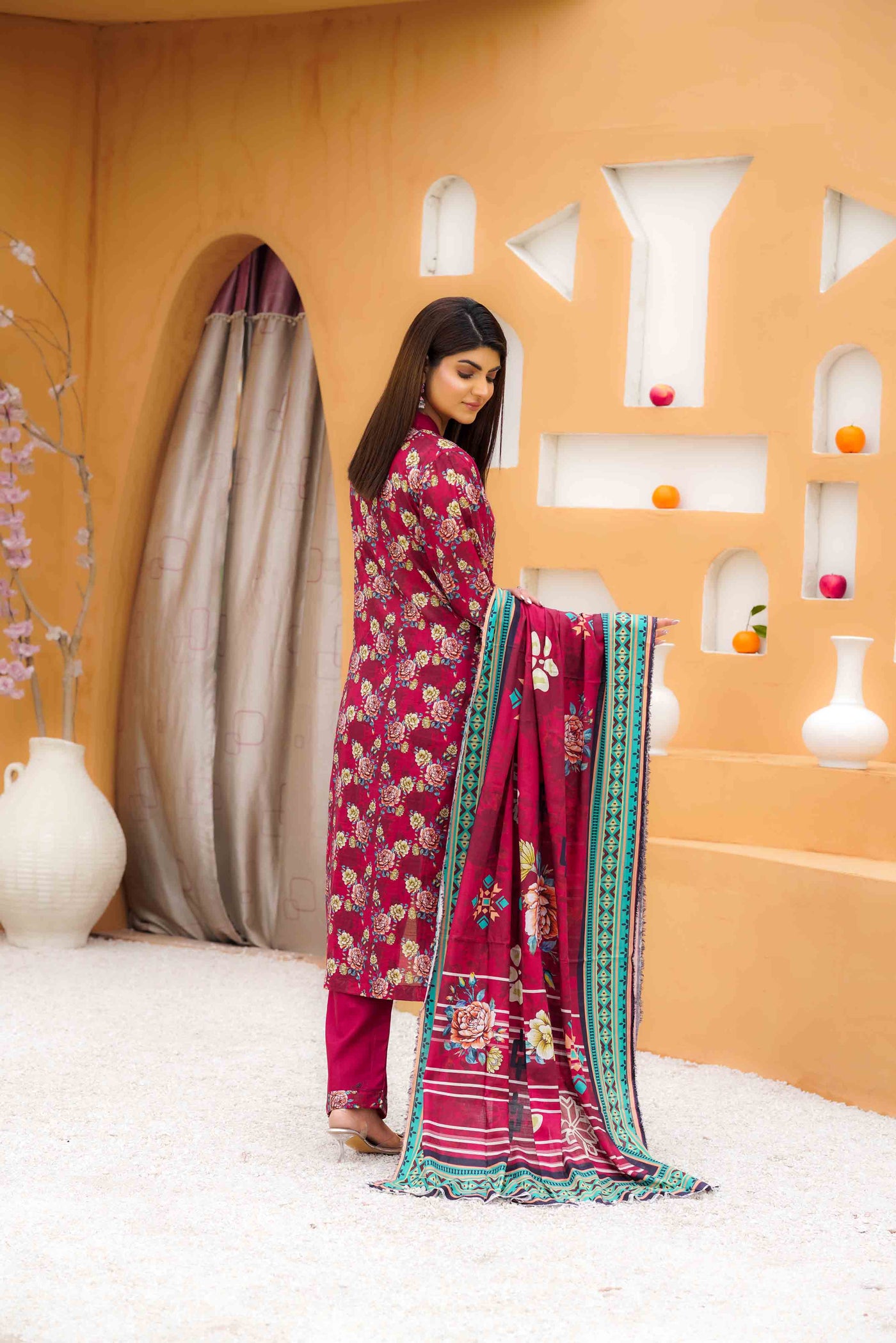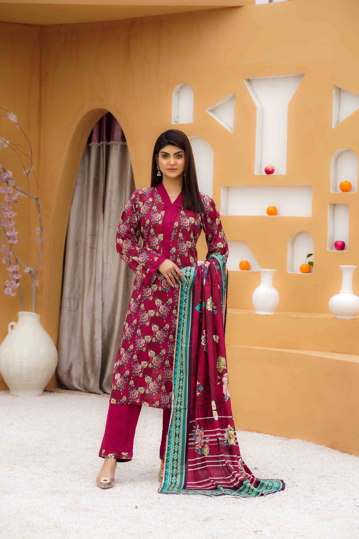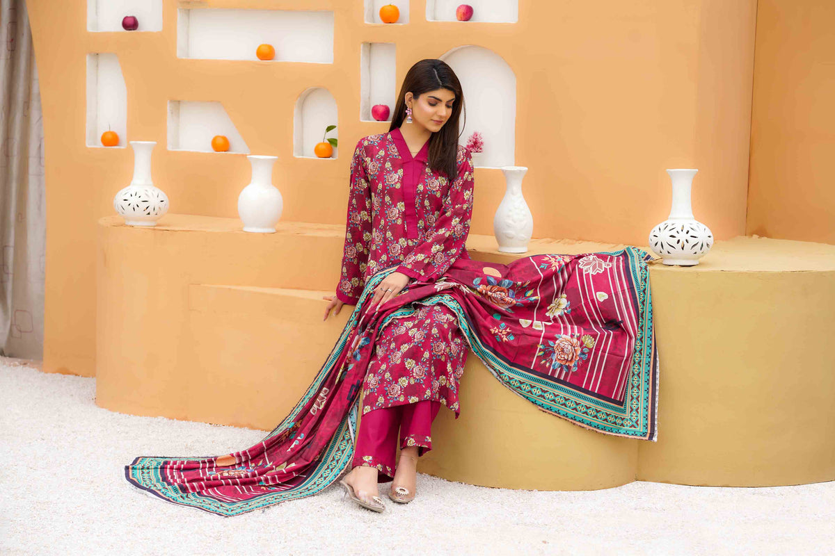 Vivid and unforgettable, this slub printed lawn ensemble in luxury red commands attention with its striking depth and refined texture. The natural weave of the slub fabric adds richness to the vibrant print, while the design speaks of passion wrapped in elegance. Light on the skin yet heavy with charm, this look is perfect for the woman who carries fire in her spirit and grace in her stride—where heritage meets high fashion in every thread.