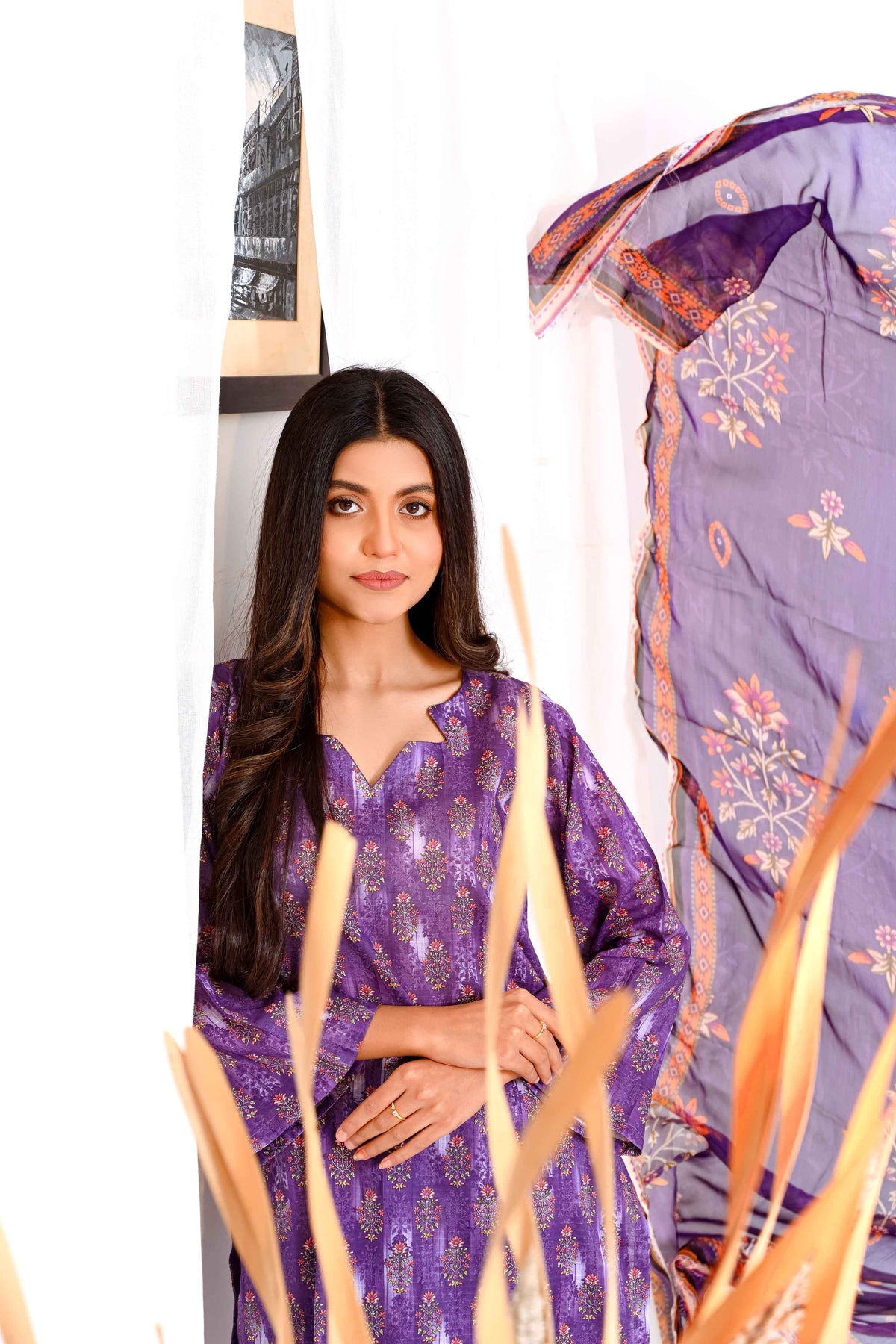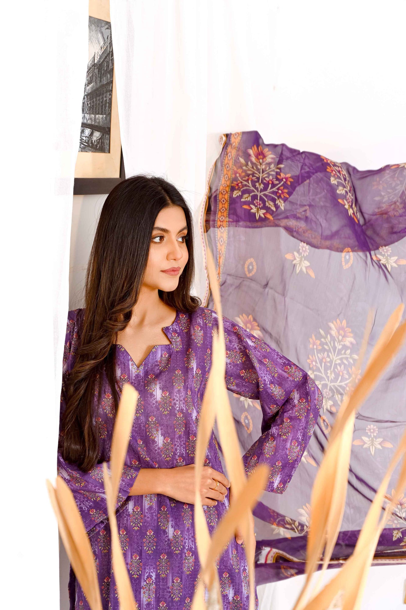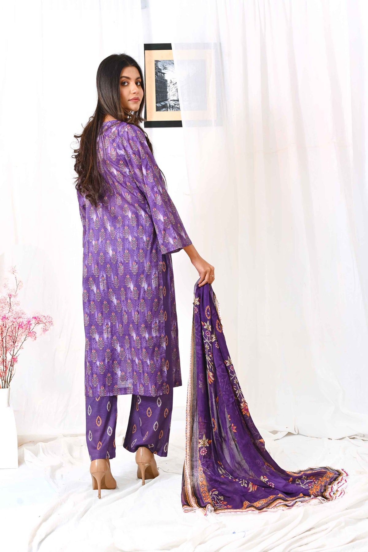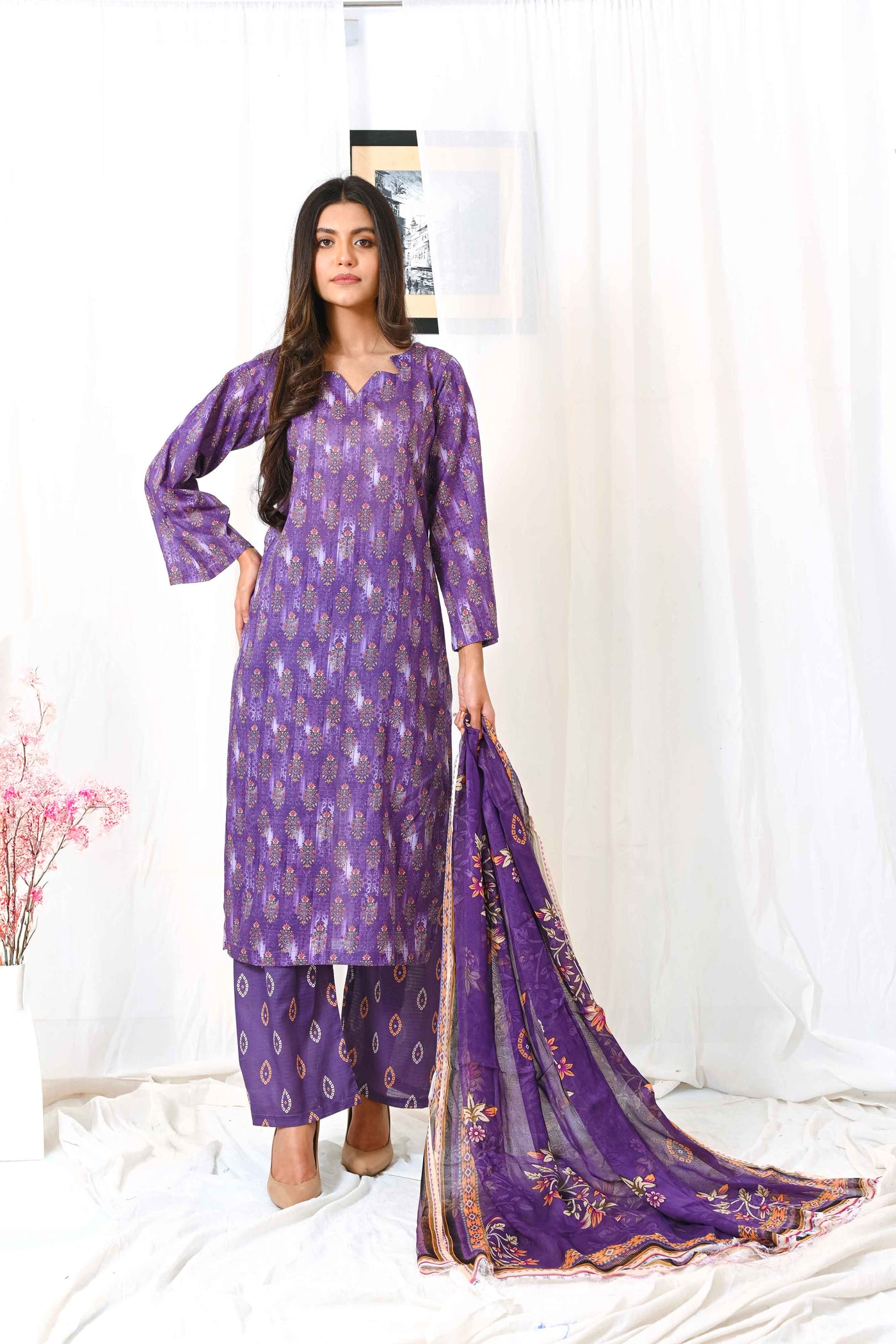 Drenched in the richness of Plum, this exquisite ensemble is a celebration of regal opulence and vibrant sophistication. The lavishly adorned shirt, featuring intricate floral artistry, exudes timeless charm, while the striking dupatta bursts into a captivating symphony of bold, colorful patterns. A perfect fusion of deep, majestic tones and lively hues, this masterpiece is crafted for those who embrace elegance with a touch of brilliance—where tradition meets modern luxury in the most breathtaking way
