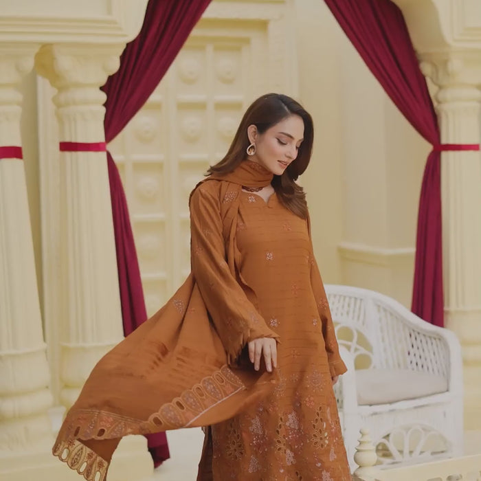 Embraced in the warmth of Luxury Mustard. This exquisite three-piece suit is crafted from premium Dhanak velvet, featuring a striped shirt beautifully adorned with intricate applique work along the daman, highlighted by multi-coloured embroidery that adds depth and artistic charm. The look is complemented by a luxurious Dhanak velvet embroidered shawl with an applique pallu on organza, designed to exude warmth and sophistication. Paired with dyed trousers, this ensemble perfectly blends timeless grace with winter opulence — a true statement of elegance and refined craftsmanship.