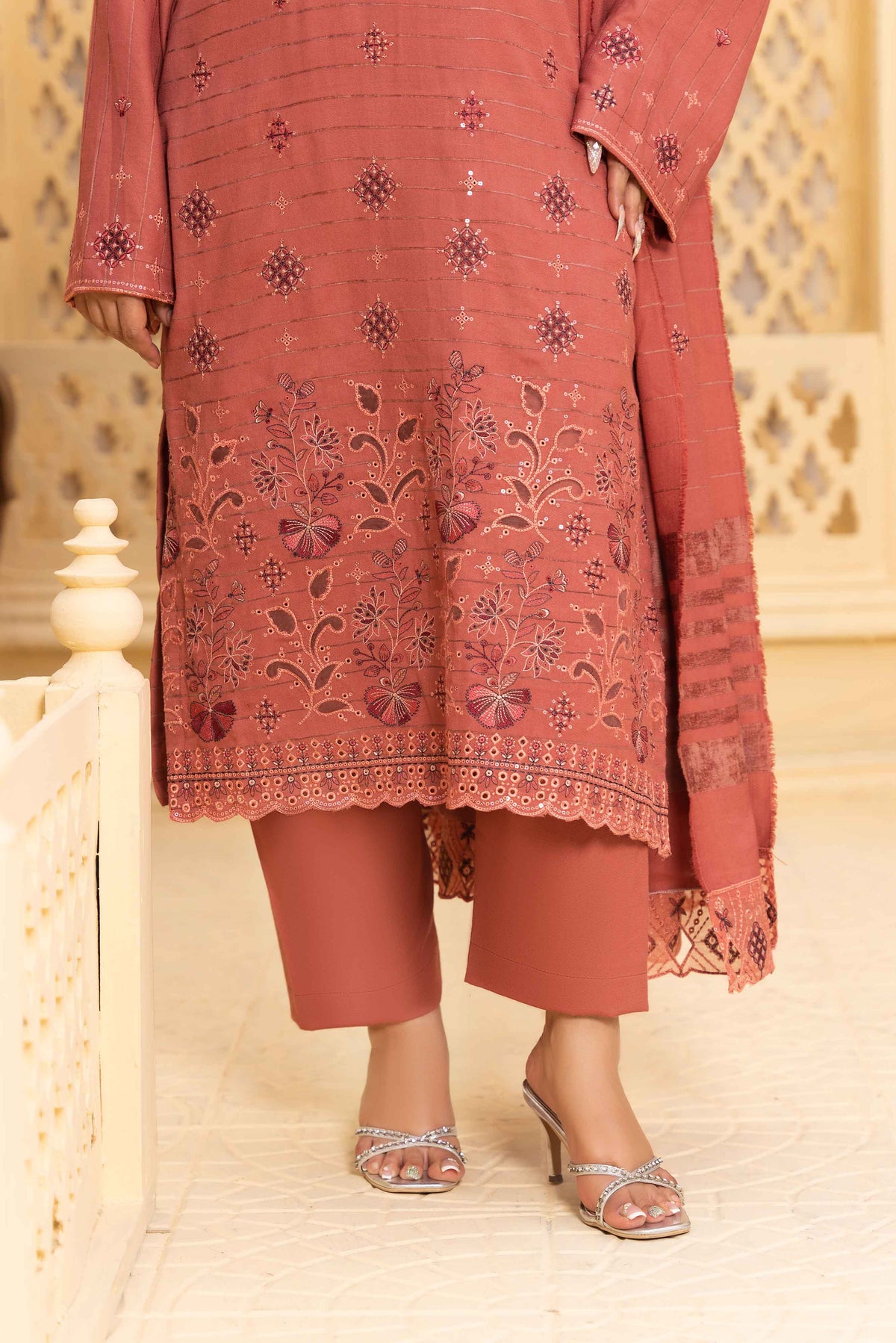 Breathed in the Passion of Luxury Peach. This exclusive three-piece suit is crafted from premium Dhanak velvet stripe shirt, featuring exquisite  applique embroidery that reflects timeless sophistication. The elegant beautifully enhanced with intricate threadwork and graceful patterns, while the luxurious dhanak velvet embroidered shawl showcases  applique pallu on organza that add a touch of refined artistry. Paired with a dyed trouser, this ensemble blends warmth, charm, and effortless elegance - a perfect statement of understated luxury.