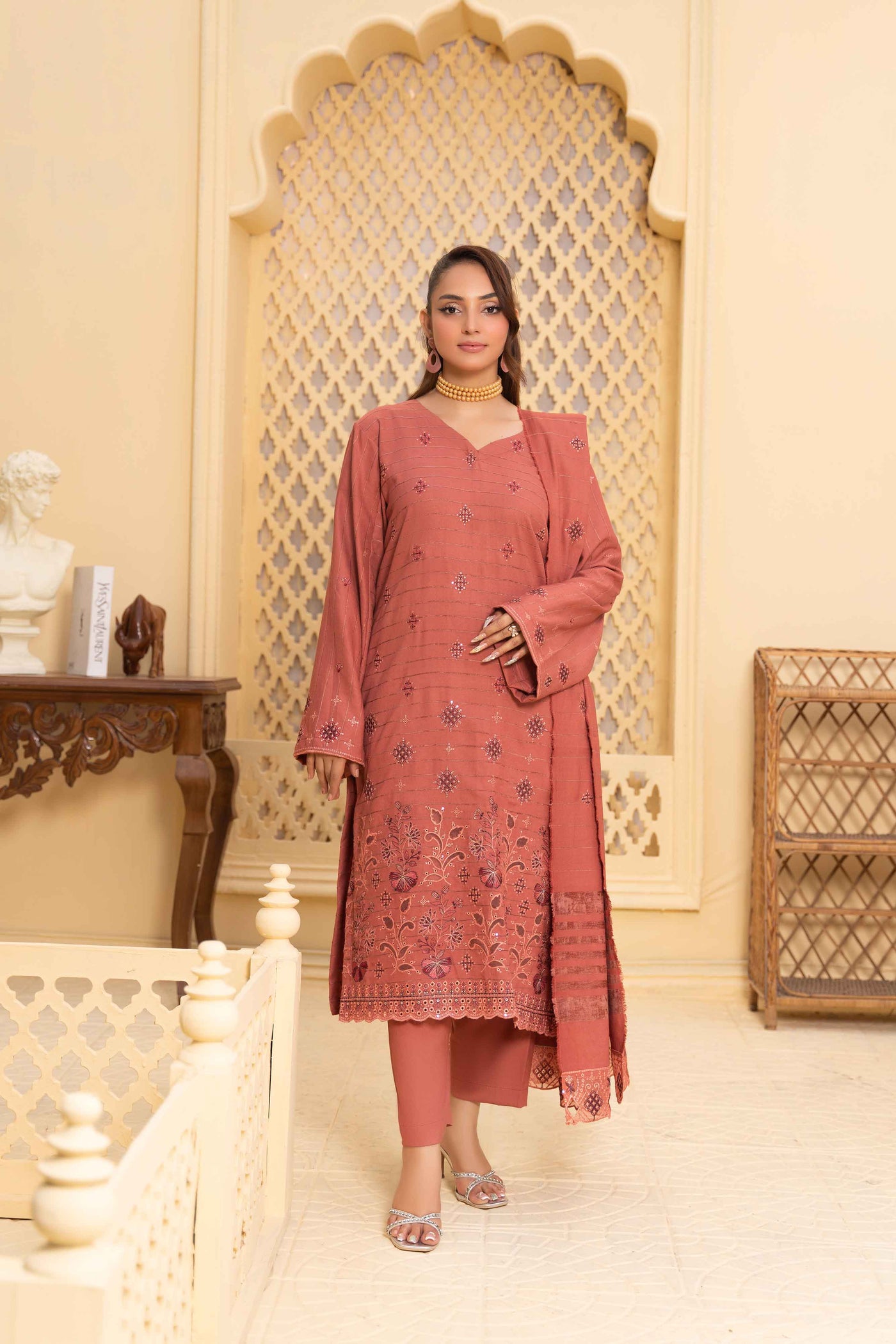 Peach 3 Pcs Dhanak Embroidered Applique suit