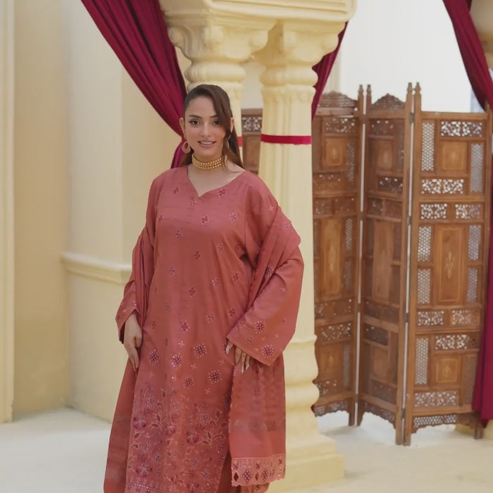 Peach 3 Pcs Dhanak Embroidered Applique suit - UNSTICHED